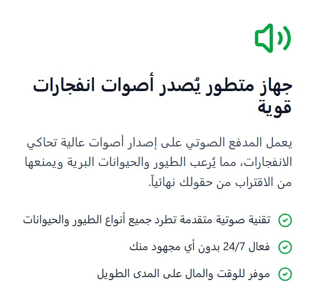 احمِ محصولك من الطيور والحيواناتتوقف عن خسارة آلاف الدراهم بسبب الطيور والحيوانات البرية. المدفع الصوتي هو الحل الأكيد والفعال! المشكلة التي تعاني منها كل يوم خسائر مالية كبيرة آلاف الدراهم تضيع كل موسم بسبب الطيور والحيوانات البرية ساعات طويلة من المراقبة تقضي وقتك كله في محاولة طرد الطيور بدلاً من العمل المفيد حلول تقليدية لا تنفع الفزاعات والشباك لا تكفي... الطيور تتعود عليها بسرعة القلق المستمر تفكر في هجوم الطيور والحيونات البرية على المحاصيل كل يوم تنتظر = خسارة أكبر في المحصول الحل الوحيد الفعال المدفع الصوتي لطرد الطيور والحيوانات البرية